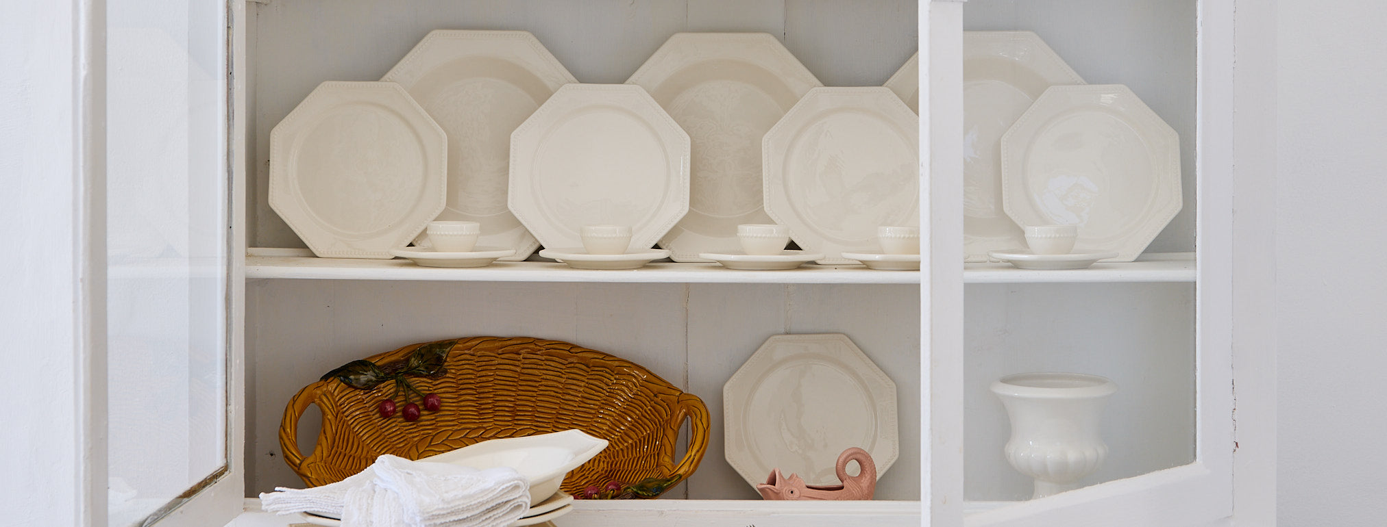 Defined by its crisp octagonal silhouette and a softly warmed cream glaze, each plate is handcrafted from earthenware clay. The form is both architectural and understated, made for everyday use.